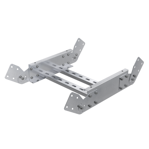 Применяется для монтажа пересечения трасс в горизонтальной плоскости. Его конструктив обеспечивает плавный поворот и предупреждает повреждение кабеля при прокладке. Х-образный ответвитель R-300 предназначен для лотков высотой 100 мм и шириной 400 мм. Для соединения секций и аксессуаров лестничного лотка необходимо использовать  соединительные пластины  IGH80, а также винты CM010612INOX, гайки CM110600INOX и шайбы.